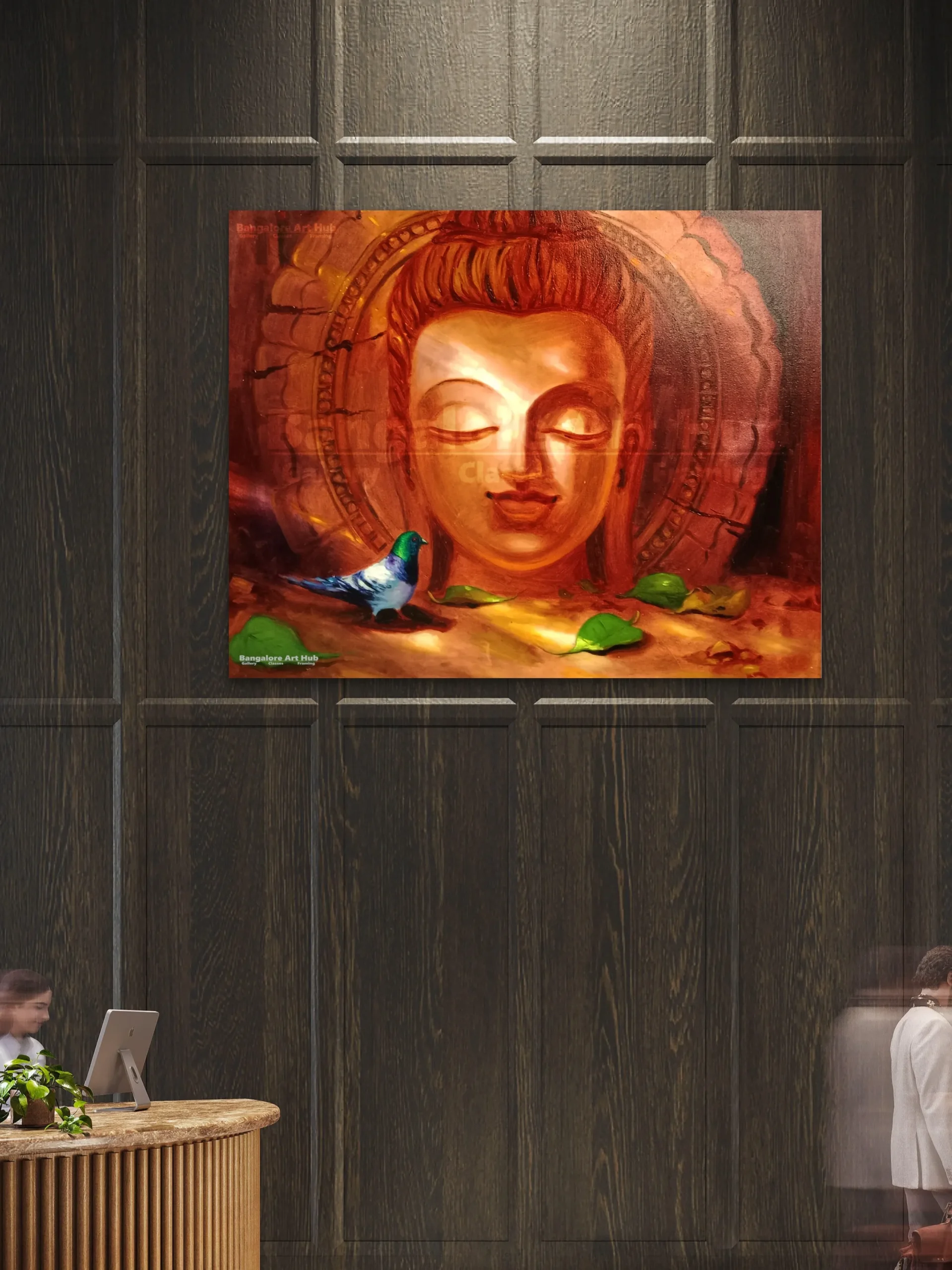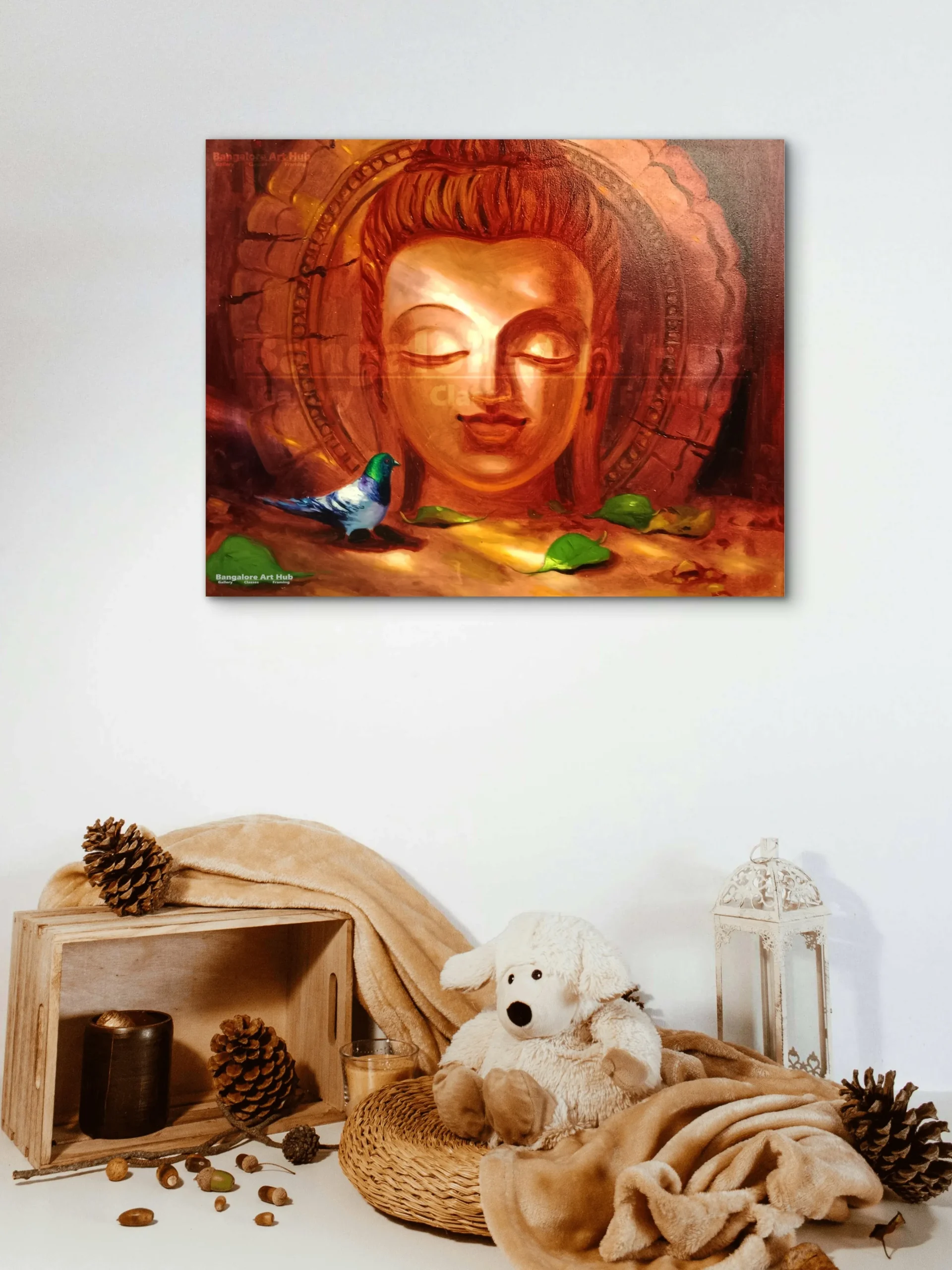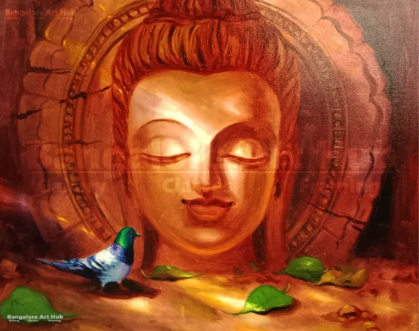This serene and soulful artwork features a calm Buddha face rendered in warm earthy tones, radiating peace, mindfulness, and inner balance. The soft glow around the face, combined with subtle textures and symbolic elements like fallen leaves and a gentle bird, creates a deeply meditative atmosphere. Painted in acrylic on canvas, this piece beautifully blends spirituality with contemporary artistic expression, making it an ideal choice for homes, meditation spaces, offices, or wellness interiors seeking calm and positive energy.