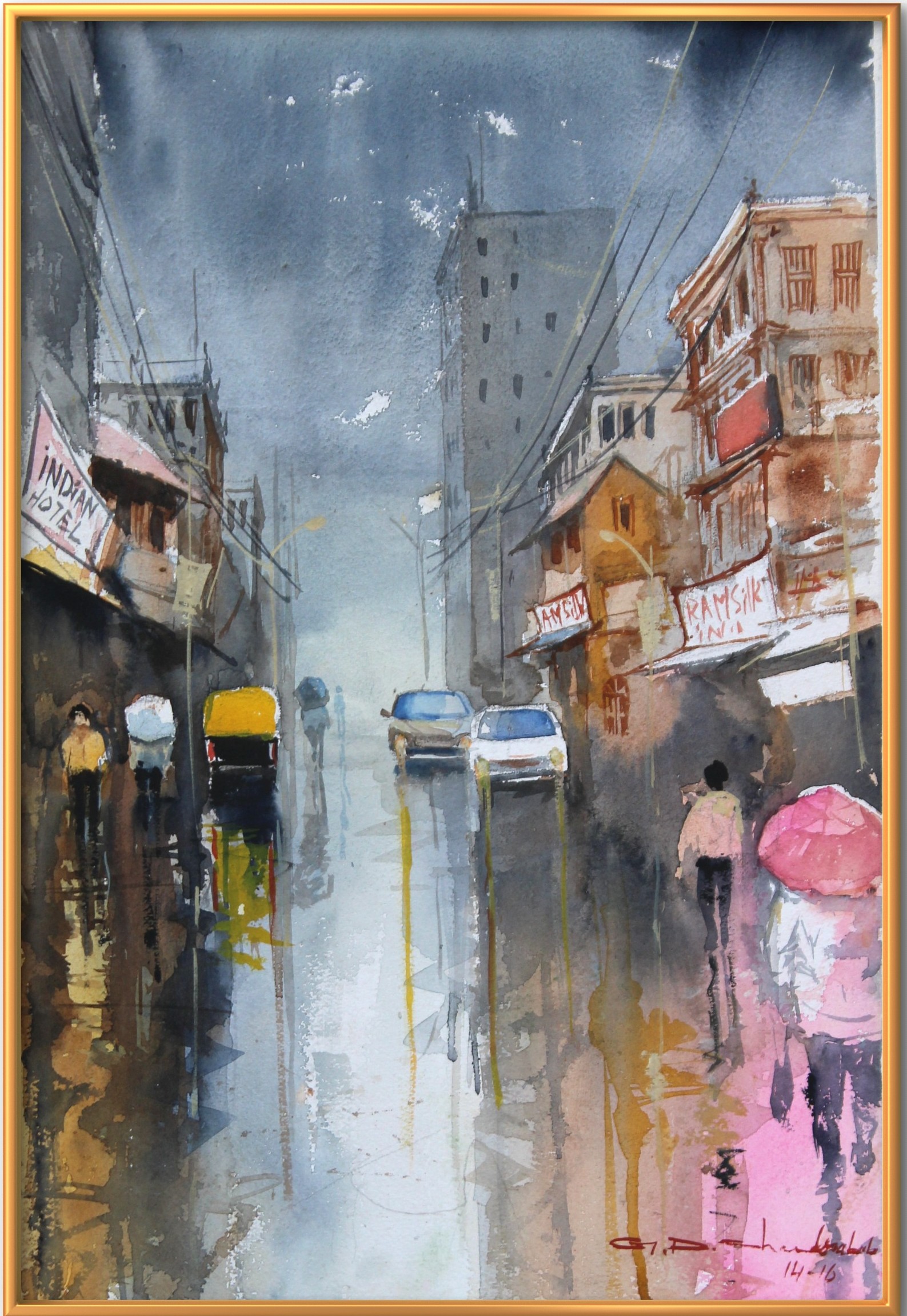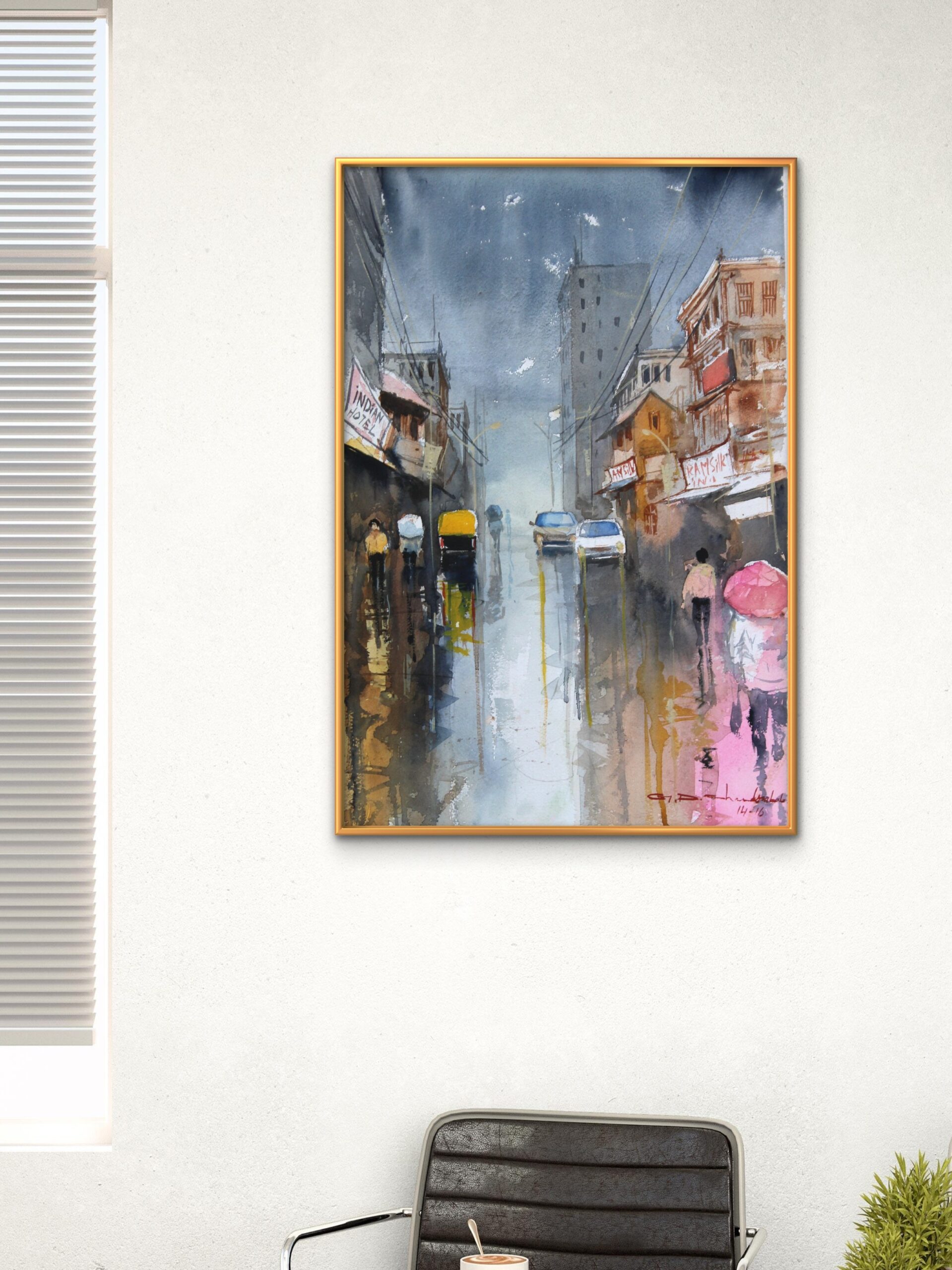 An atmospheric watercolor cityscape capturing a rain-soaked street with glowing reflections, umbrellas, and everyday movement. The loose brushwork and warm tones bring a sense of life and nostalgia, making it a perfect accent for contemporary homes or office interiors.