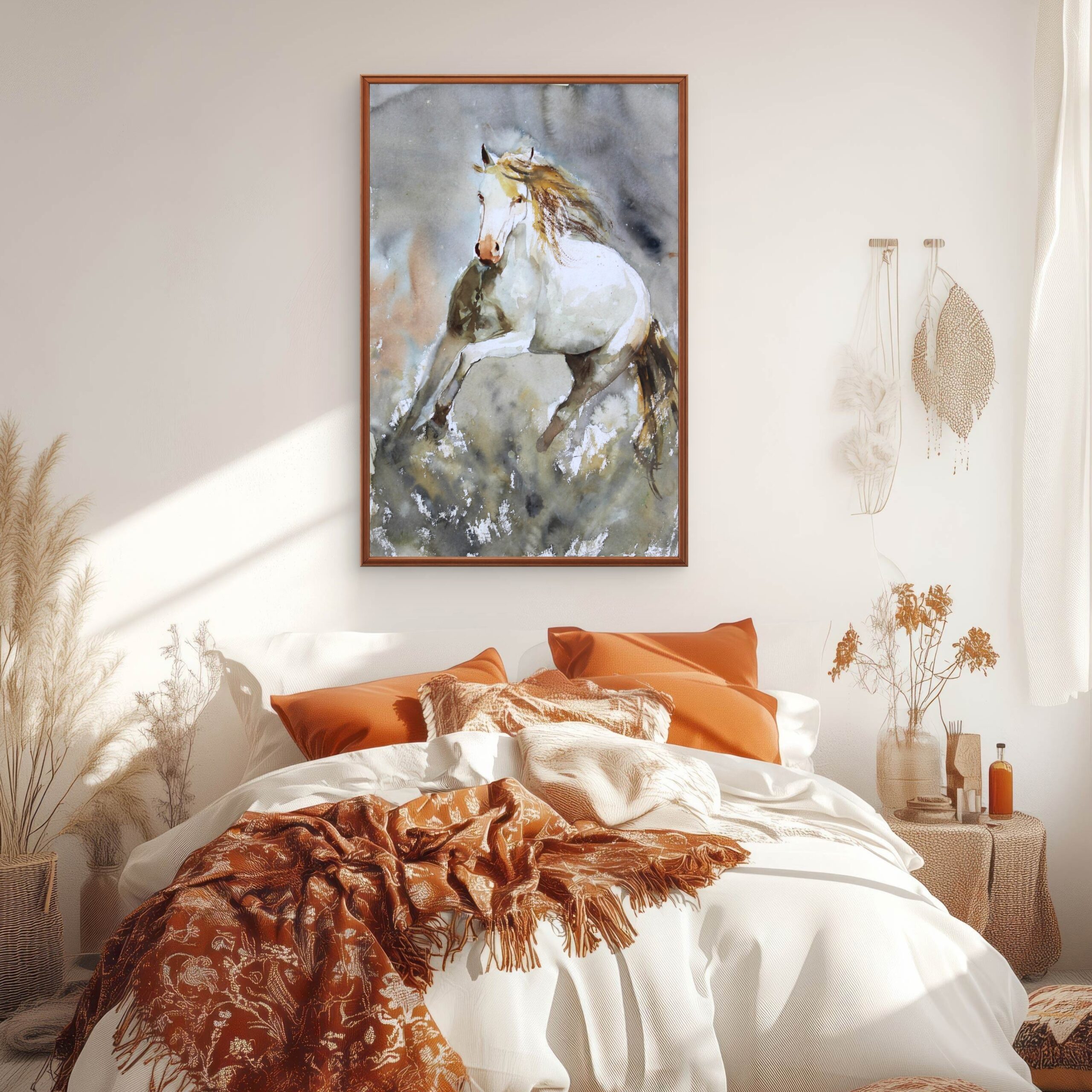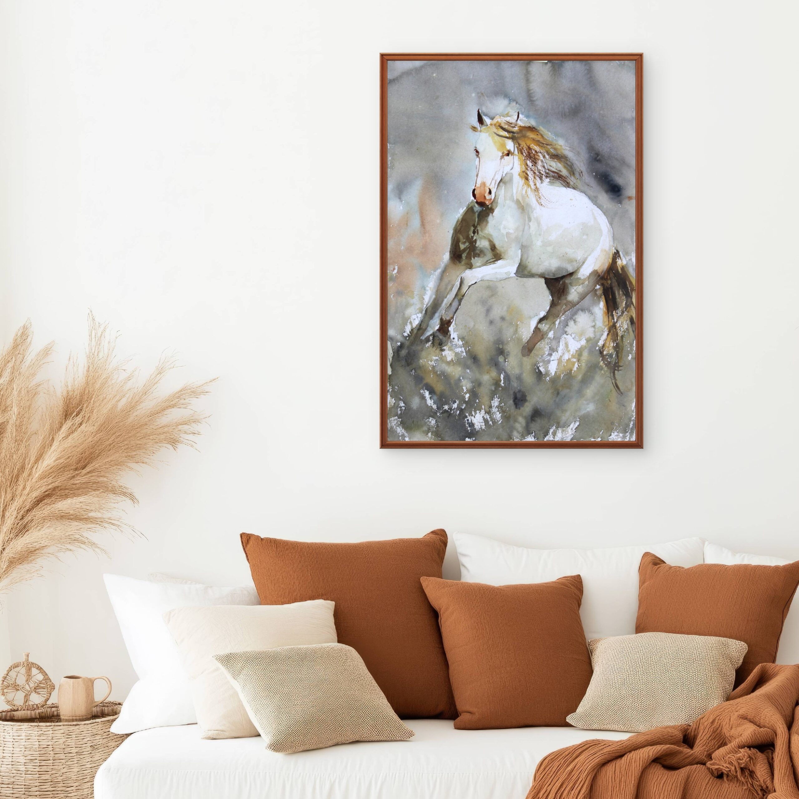 A graceful watercolor painting of a horse in motion, rendered with soft washes and expressive brushstrokes. This artwork captures strength, freedom, and elegance, making it a timeless piece for art lovers and refined interior spaces.