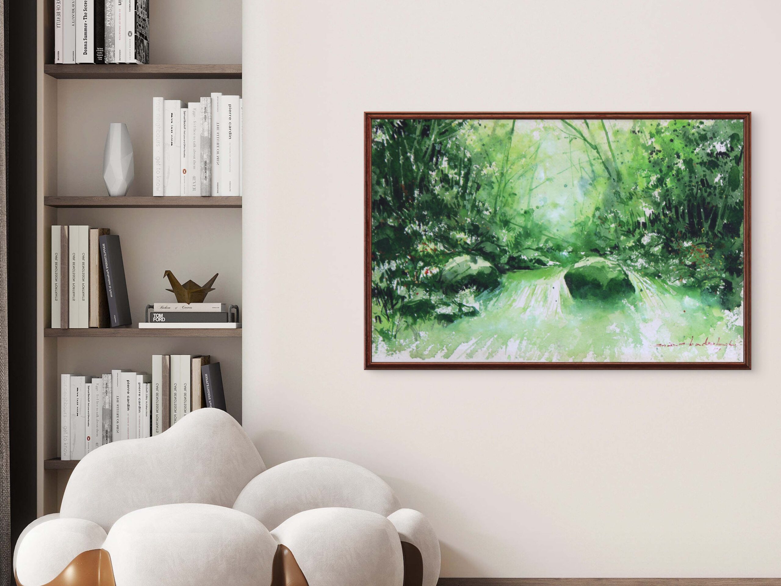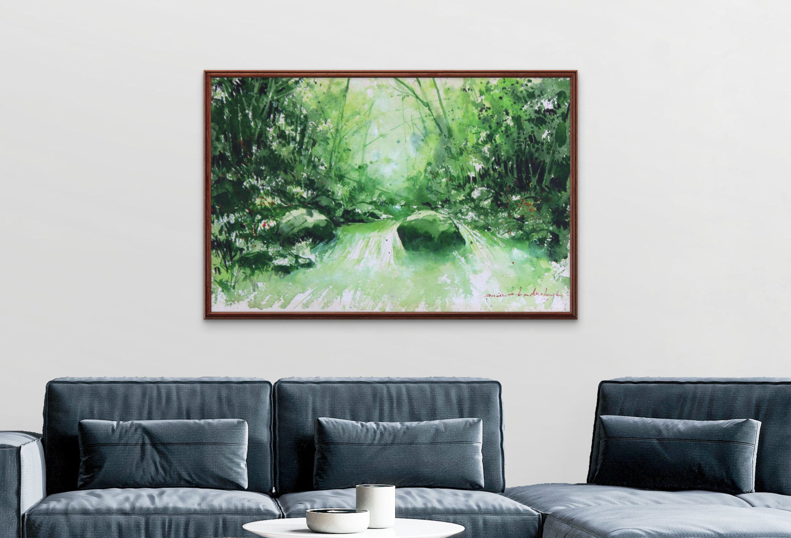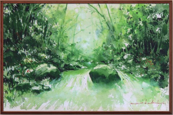 A soothing watercolor landscape filled with lush green foliage and soft light, evoking the calm and freshness of nature. This artwork brings a sense of peace and natural beauty, perfect for creating a relaxing atmosphere in any living or workspace.