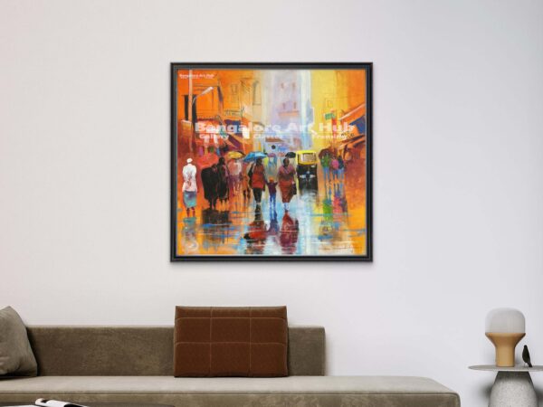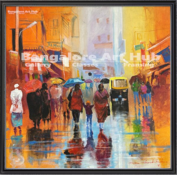 Figures, umbrellas, and reflections create a sense of movement and urban rhythm.